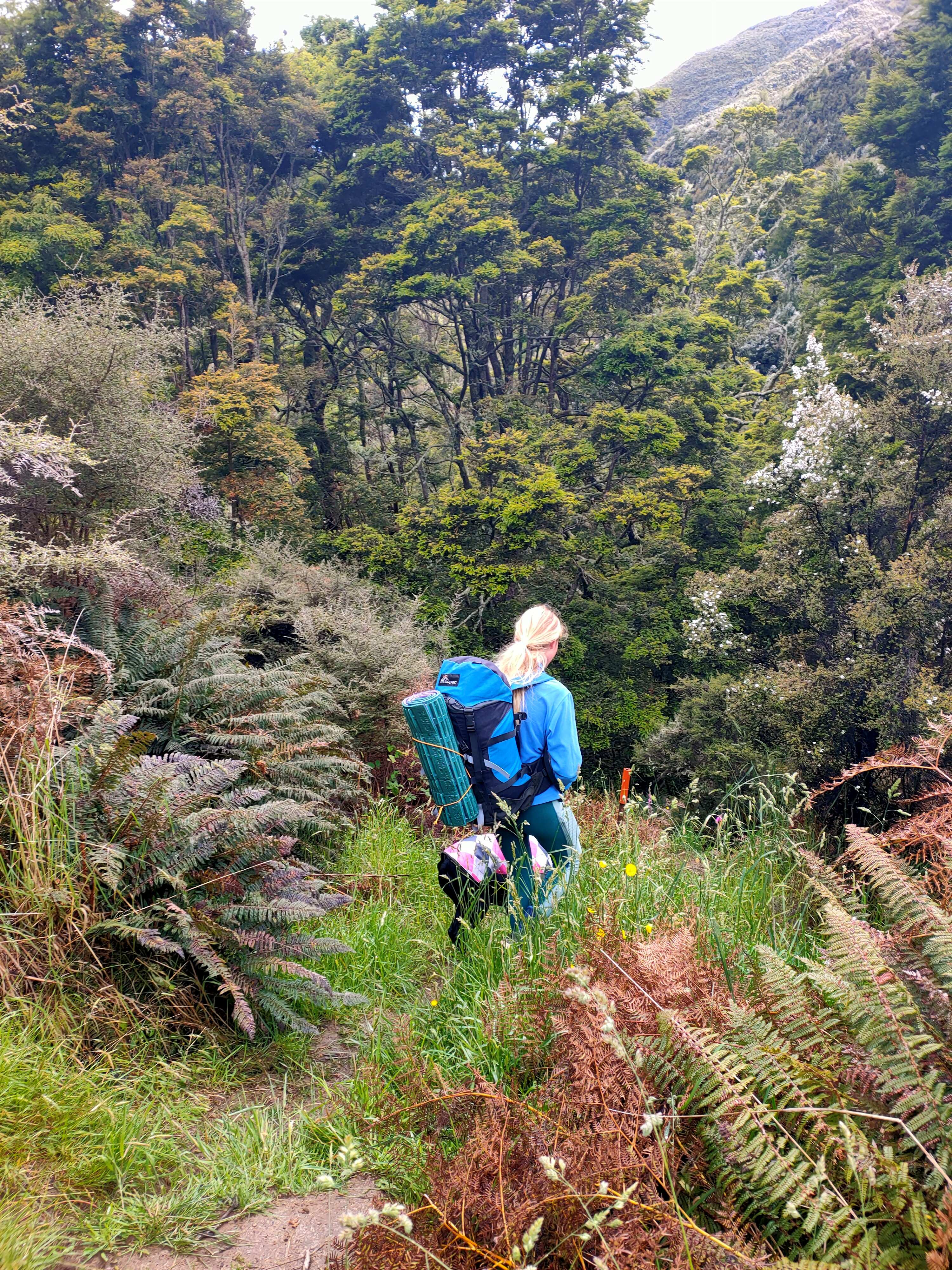 Many hours later that night, my husband and I set off at the start of the trail to the first hut, shadows moving from the glow of our headtorches. After 4.5 hours of hiking, we finally reached the hut. It was well past midnight. The dog barked as we climbed the steps onto the verandah, and there she was, sitting up in her sleeping bag, eyes wide and blinded by our lights, clearly wondering what on earth was happening. Safe and sound. The next morning, we sent her off with fresh strawberries, an emergency blanket, and a foam mat. Just in case.